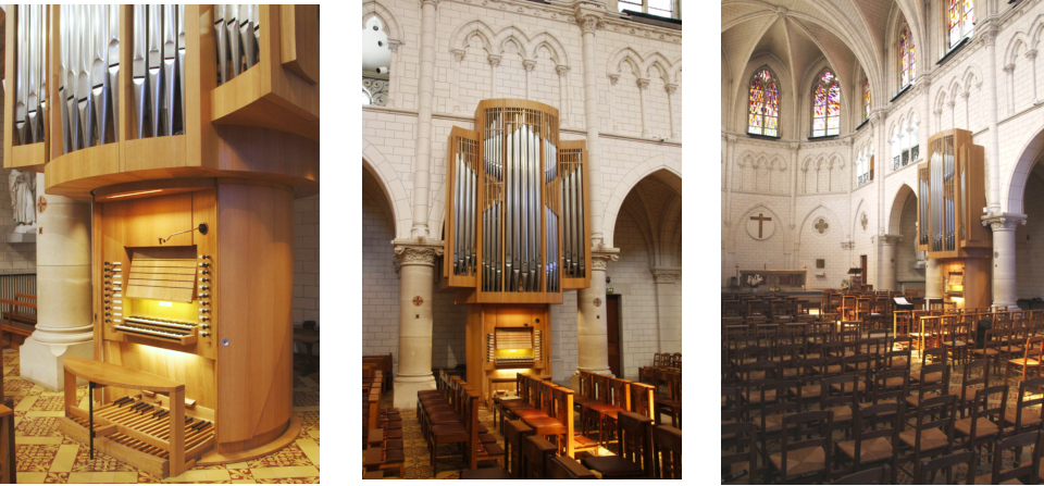E1L’instrument à construire est un orgue de style polyphonique particulièrement adapté au répertoire baroque allemand, mais aussi flamand, français, italien. Il comprendra 19 jeux et 1258 tuyaux répartis sur deux claviers et une pédale.L’orgue se glisse et recouvre l’arc d’un bas coté. L’ensemble du buffet est en panneaux de type multiplis avec un plaquage chêne clair. Deux portes coulissantes cintrées protègent la console qui est intégrée au buffet. L’éclairage des claviers et pédalier est assuré par des rubans led. Deux spots sous le débord du buffet détachent l’orgue des piliers.Source