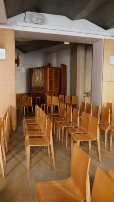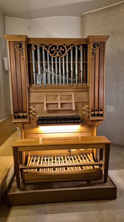 E6Aménagée entre 1995 et 1998, ce nouveau lieu de culte fut équipé d’un petit orgue Merklin, mis à disposition par son organiste, René Desroches. En 2008, à l’initiative du curé Maillard de la Morandais (anciennement Ste Clotilde) la chapelle reçue un orgue construit par Paul Simond-Côte (1925-2007), et daté de 1993. Il fût installé dans la chapelle par le facteur Yves Fossaert durant l’hiver 2008 afin de soutenir la prière des nombreux passagers, voyageurs, travailleurs de ce quartier, dont la chapelle leur offre une halte bien précieuse et un espace de recueillement bien précieux dans le tourbillon animé de la vie urbaine.